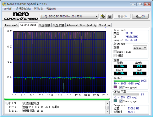 目前市面上还没有出现4速BD-R光盘(已经研发成功,但仍然没有最终上市),但通过光盘信息我们能够很清晰的看到,在写入速度一栏上面的“2.0X-4.0X”这也就意味着,明基BW1001能够使用此光盘超刻至4倍速,但在实际的写入过程却让我们失望之极! 最终明基BW1001整整花费47分钟才完成一张25GB BD-R光盘的写入过程,如果刻2张盘这样的光盘,那就是一场足球比赛了…… ● BD-RE复写 明基BW1001仅仅支持2倍速BD-RE复写,46分钟完成写入也只能说是中规中矩,倒是擦写的过程相当快速,甚至可以用“一眨眼”来形容。 ● DVD-R & CD-R写入