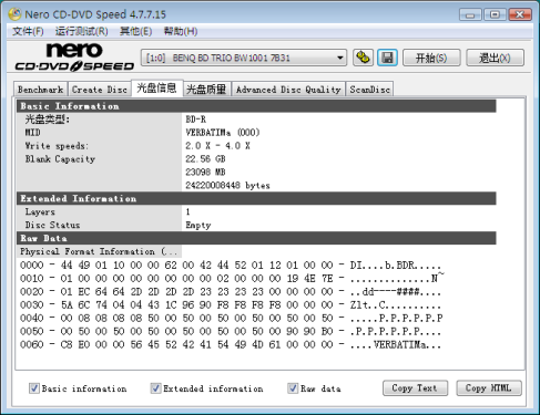 根据CdrInfo的数据,比较有公正性的测试方法是使用DaTARIUS的专业测试机,当然笔者不可能有这样的设备!不过我们却发现明基BW1001具备有测试BD光盘片质量的特殊能力。