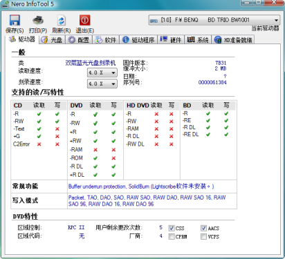 明基BW1001,它同样采用SATA接口,并且支持4倍速BD-R,2倍速的BD-RE,及4倍速BD-ROM。同时,BW1001还向下兼容12倍速DVD±R,8倍速DVD±RW及4倍速DVD±R DL,支持32倍速CD-R和24倍速CD-RW。
