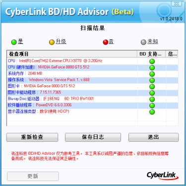 点击放大:播放蓝光和HD DVD的系统需求 NVIDIA PureVideo HD的讲解演示,其中非常明确的显示出了播放蓝光/HD DVD高清影碟的系统需求,包括驱动器、显示卡、播放软件与显示设备都必须支持高清内容保护机制(HDCP)。其实搭配高清非常简单,符合内容保护机制就可以! 目前来说,支持高清内容保护机制已经不再是问题,显卡、显示器包括刻录、播放软件甚至是一次性蓝光刻录盘都已经随处可见。只要你的显卡可以硬解码H.264和VC-1,那么目前的双核处理器完全能够胜任蓝光播放已经刻录的所有需求。 ● HDCP检测软件 如果不知道自己的电脑是否能够支持高清也没有关系,目前很多软件厂商提供测试软件下载,我们这里使用的是明基BW1001包装里面自带的CyberLink BD/HD Advisor,绿色代表支持,结果显而易见! ● AnyDVD HD的贡献 正如HD DVD破解者muslix64说的那样,破解HD DVD和BD影碟的念头是因为他的显卡不支持HDCP功能,以至于他购买的正版HD DVD影碟无法在他的电脑上正常播放,这一点让他非常气愤。