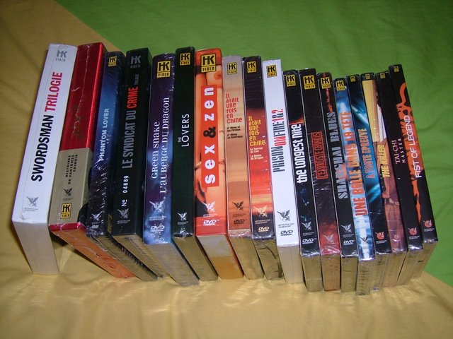 令我庆幸的是,周围有四五个同学都很喜欢dvd,大家一起去当时学校后面的js那里买碟子。那时候还是对dvd很模糊,什么d5d9,什么dts、AC-3,什么16:9统统都不知道,仅仅是对自己对电影的热爱而不知疲倦的买自己喜欢的片子,当时的价格很贵,很普通的d5都要8元一张,而且不知道是什么牌子的,这对一个穷学生来说真的是一笔不小的投入。买dvd几乎占据了我每个月三分之一的开销。不过最初的dvd华语片真的很少,以至于有近两年的时间我在joyo,搜狐买了很多垃圾的六区碟子。最早还像样的有个盒装,然后慢慢都是简装,价格属实很诱惑人,很多新片都是购买一定数目加一元两元就能买到,记得《终极无间》《周渔的火车》好像是都是2块钱买的,不过画质真的惨不忍睹。于是我更加坚定自己在js那里寻找我喜欢的港片的决心,几乎见到港片就收,当然不像今天能够分辨出是港三韩三还是日二法二德二,是数码修复还是多区复合(在随后的照片中可以看到一些早期的碟子,包装很可怜,就一张纸片,比如《天地雄心》《不脱袜的人》《梁山伯与朱丽叶》,这些虽然简陋,但是现在很不好找到三区的了)。04年参加工作,收碟成为我每周必定的习惯,而自己也渐渐固定了几个js,同时对dvd的了解也跟多了,从最初的简五,套装,到简九,精九,从市场淘碟到淘宝寻觅,我学会了很多东西,更加加深我对电影的理解和感悟。